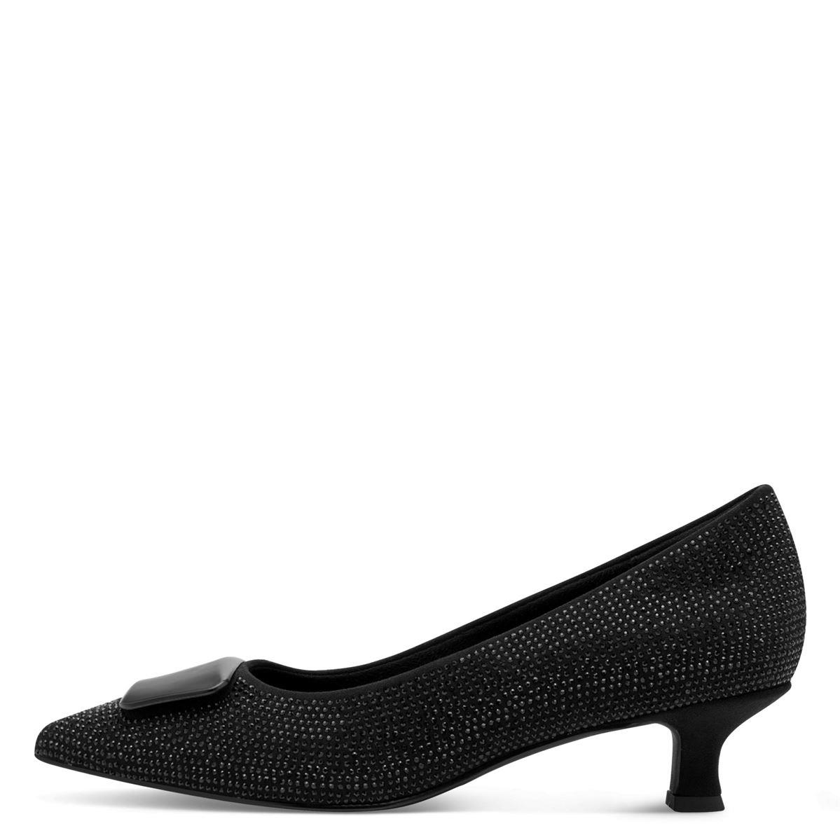 Γυναικείες γόβες της εταιρείας MARCO TOZZI κατασκευασμένες εξωτρικά από ύφασμα με μαύρα στρασάκια και μοντέρνα αγκράφα, ενώ εσωτερικά το πατάκι είναι οικολογικό δέρμα, σειρά vegan, και η φόδρα υφασμάτινη. Η σόλα είναι ελαστική και αντιολισθητική. Το τακούνι έχει ύψος 4 εκατοστά. Διαθέτουν το ειδικό αφρώδες εσωτερικό πάτο της MARCO TOZZI, τεχνολογία feel me, που σας εξασφαλίζει πολύ άνετο και μαλακό βάδισμα. Ιδανικές γόβες για επίσημες εμφανίσεις.