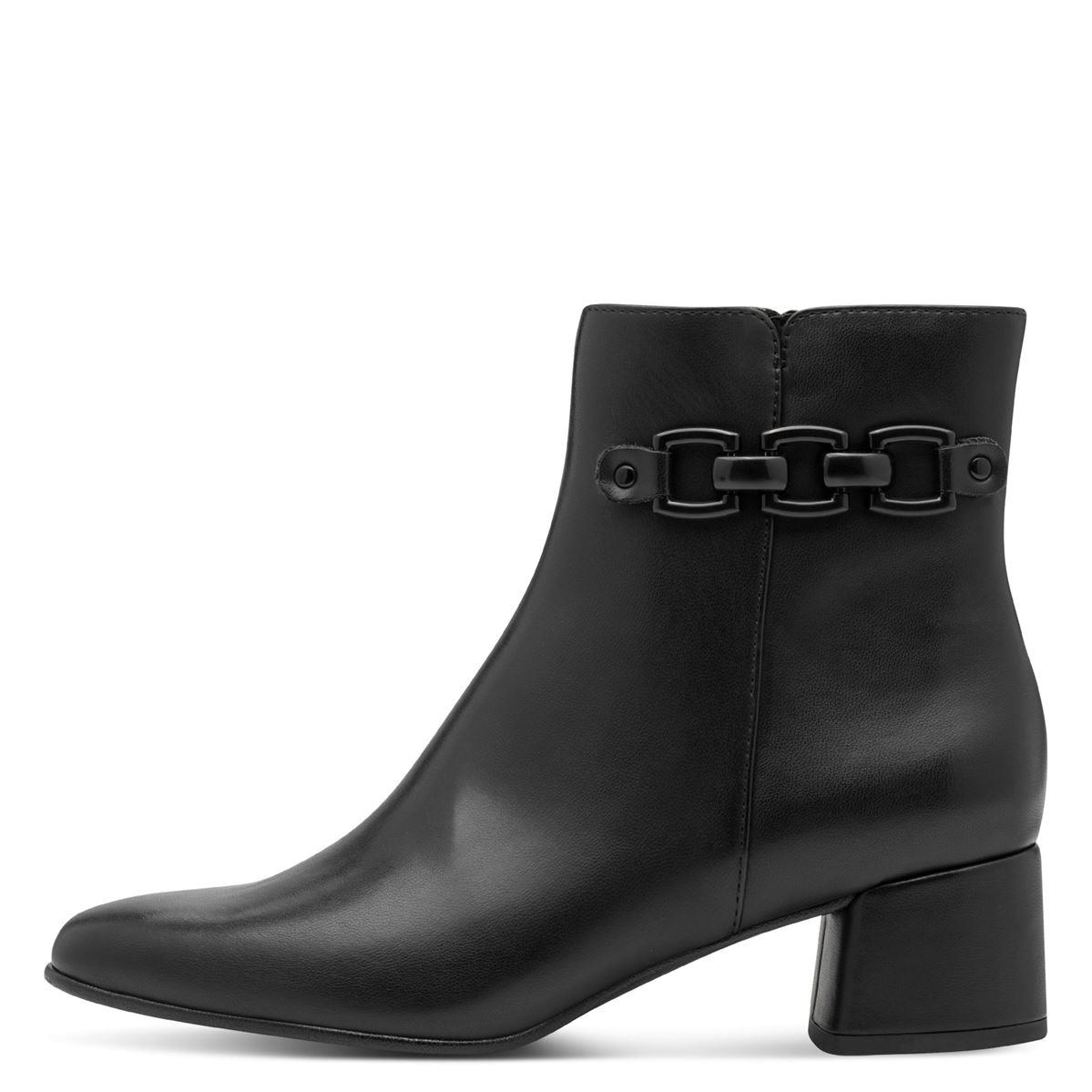Γυναικεία μποτάκια της εταιρείας MARCO TOZZI με φερμουάρ στο πλάι για εύκολη και γρήγορη εφαρμογή. Εξωτερικά είναι κατασκευασμένα από μαλακό, οικολογικό δέρμα, ενώ εσωτερικά το πατάκι και η φόδρα είναι γούνινα. Ο εσωτερικός πάτος είναι ανατομικός, πολύ μαλακός, χάρη στην αφρώδη επένδυση, τεχνολογίας feel me. Η σόλα είναι ελαστική και αντιολισθητική. Το ύψος του τακουνιού είναι 5 εκατοστά. Με σικάτη διακοσμητική αλυσίδα στο πλάι, διαχρονικό στυλ, ποιότητα κατασκευής, άνεση, είναι τα στοιχεία που θα σας κάνουν να τα προτιμήσετε.
