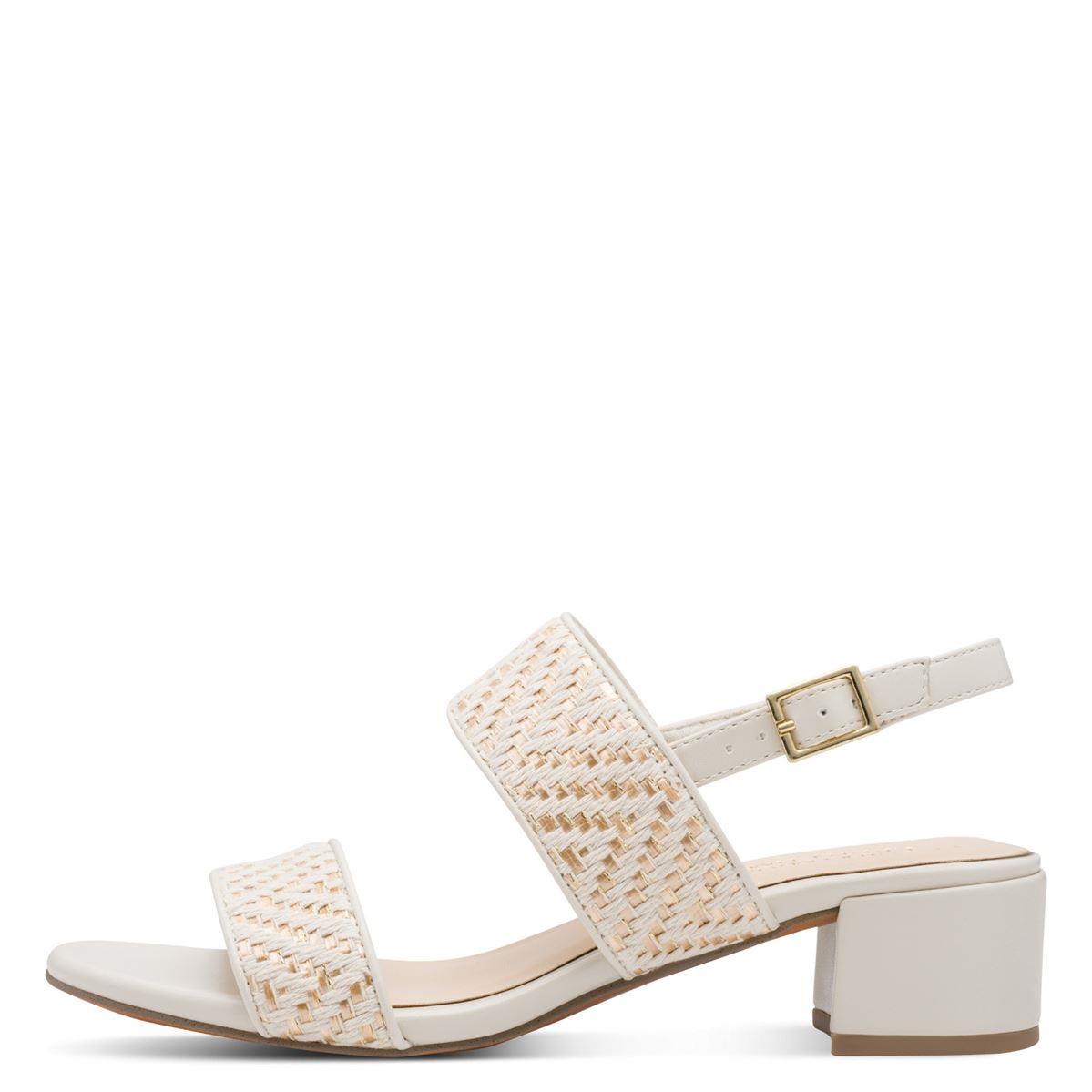 Γυναικεία πέδιλα της εταιρείας MARCO TOZZI κατασκευασμένα εξωτερικά από ύφασμα τύπου ψάθας, σε κρεμ απόχρωση με μεταλλιζέ χρυσές λεπτομέρειες, και οικολογικό δέρμα, ενώ εσωτερικά η φόδρα είναι υφασμάτινη και το πατάκι οικολογικό δέρμα. Διαθέτουν αφρώδη επένδυση στο πατάκι, τεχνολογία feel me, για μαλακό πάτημα. Το τακούνι είναι σταθερό, έχει ύψος 4 εκ. και η σόλα είναι ελαστική και αντιολισθητική. Κλείνουν με τοκαδάκι, το οποίο έχει και λαστιχάκι εσωτερικά, όπως λαστιχάκι έχει και το λουράκι στο κουντεπιέ, για να εφαρμόζει τέλεια σε όλα τα πόδια. Ξεχωριστά και άνετα πέδιλα που μπορούν να φορεθούν σε καθημερινές, αλλά και σε πιο επίσημες εμφανίσεις.