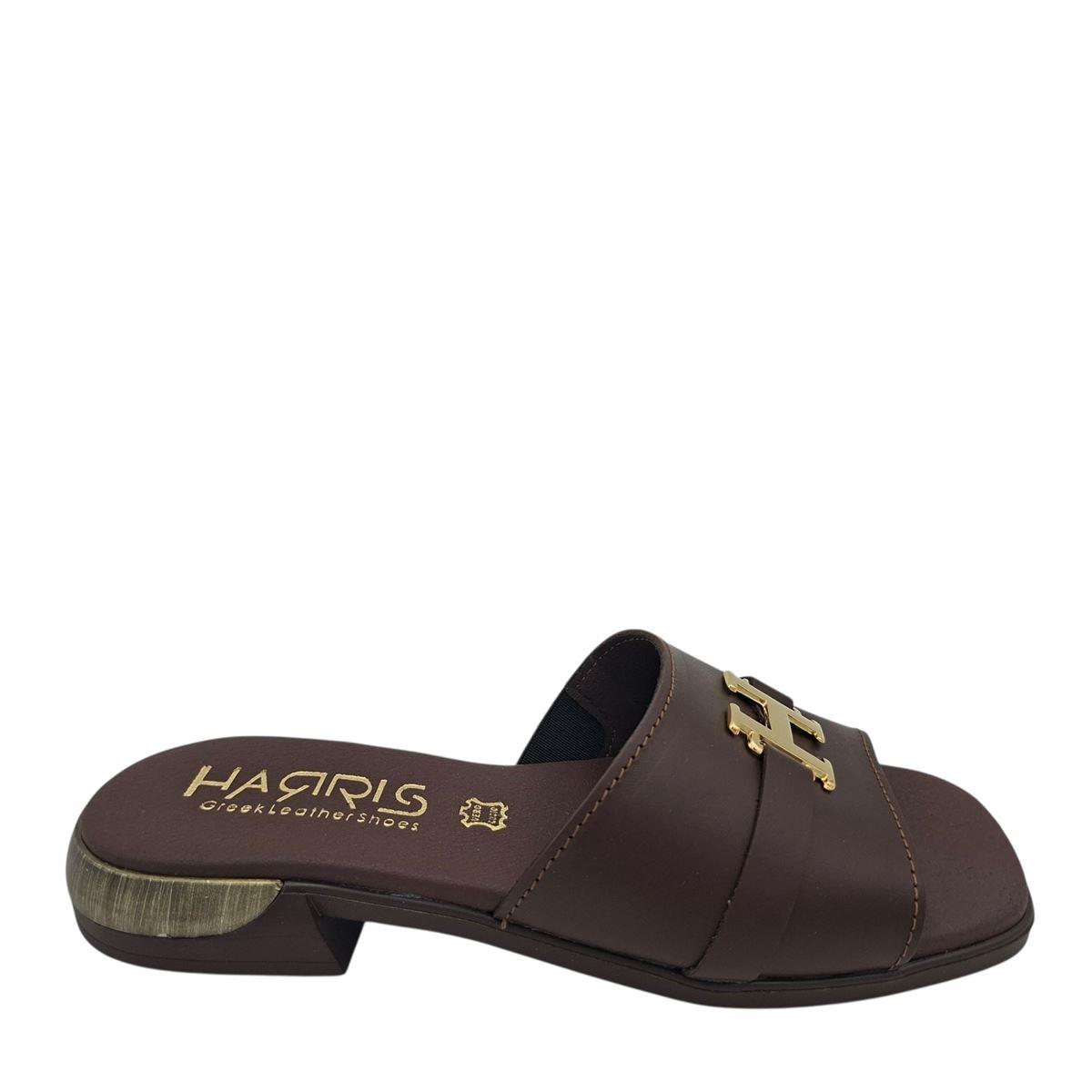 Γυναικείες παντόφλες flat της εταιρείας HARRIS ελληνικής κατασκευής, με φάσα που αγκαλιάζει πολύ καλά τα πόδια και εντυπωσιακή, διακοσμητική αγκράφα και ιδιαίτερη μεταλλική λεπτομέρεια στο τακούνι, κατασκευασμένες εξωτερικά και εσωτερικά από γνήσιο δέρμα. Διαθέτουν επένδυση από αφρολέξ στο πατάκι, για να έχετε μαλακό πάτημα. Η σόλα είναι ελαφριά και αντιολισθητική, με ύψος 2,5 εκ. πίσω και 1 εκ. μπροστά, για ακόμη πιο άνετο βάδισμα. Ξεχωριστές παντόφλες που συνδυάζουν ποιότητα, άνεση και στυλ!