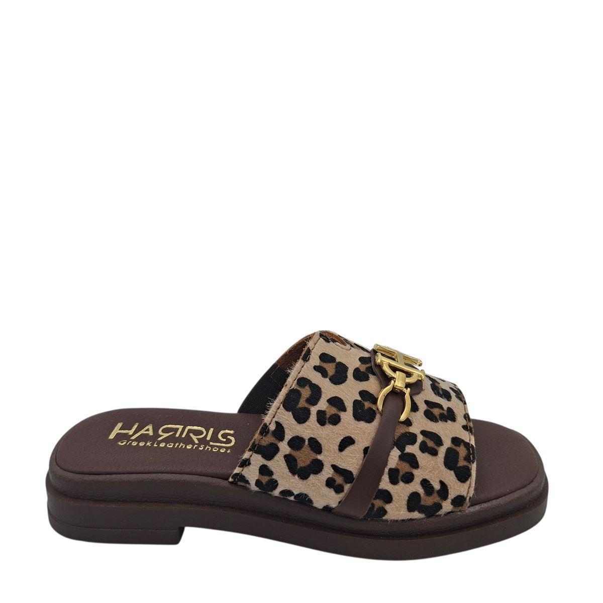 Γυναικείες παντόφλες flat της εταιρείας HARRIS ελληνικής κατασκευής, με φάσα που αγκαλιάζει πολύ καλά τα πόδια και διακοσμητική αλυσίδα, κατασκευασμένες εξωτερικά από λεοπάρ ύφασμα, εσωτερικά το πατάκι είναι από γνήσιο δέρμα και η φόδρα υφασμάτινη. Διαθέτουν επένδυση από αφρολέξ στο πατάκι, για να έχετε μαλακό πάτημα. Η σόλα είναι ελαφριά και αντιολισθητική, με ύψος 3,5 εκ. πίσω και 2 εκ. μπροστά, για ακόμη πιο άνετο βάδισμα. Ξεχωριστές παντόφλες που συνδυάζουν ποιότητα, άνεση και στυλ!