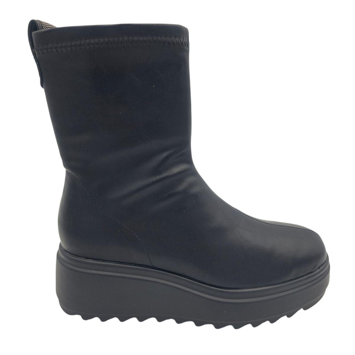 Γυναικεία μποτάκια πλατφόρμες της ισπανικής εταιρείας MTNG κατασκευασμένα εξωτερικά από ελαστικό συνθετικό δέρμα, που αγκαλιάζουν τα πόδια σαν κάλτσα, ενώ εσωτερικά είναι υφασμάτινα. Ο εσωτερικός πάτος είναι ανατομικός, πολύ μαλακός, χάρη στην αφρώδη επένδυση. Η σόλα είναι ελαφριά, αντιολισθητική και με ύψος 6 εκ. πίσω και 4 εκ. μπροστά. Μοντέρνα και άνετα μποτάκια ιδανικά για all day εμφανίσεις.