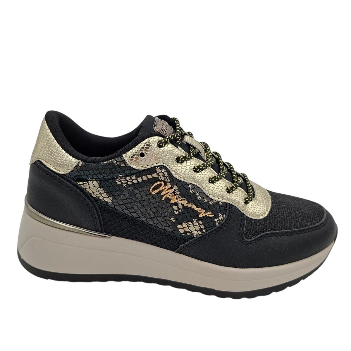 Γυναικεία sneakers της ισπανικής εταιρείας MARIAMARE με ελαστικά κορδόνια για εύκολη και γρήγορη εφαρμογή. Είναι κατασκευασμένα εξωτερικά από μαλακό, συνθετικό δέρμα ματ, χρυσό μεταλλιζέ snake, animal print δέρμα και μεταλλιζέ μαύρο ύφασμα, ενώ εσωτερικά είναι υφασμάτινα. Διαθέτουν αποσπόμενο, ανατομικό, αφρώδες πατάκι για ξεκούραστο βάδισμα. Η σόλα είναι ελαφριά, αντιολισθητική με μεταλλική λεπτομέρεια και έχει ύψος 6 εκ. πίσω και 3 εκ. μπροστά. Άνετα και στυλάτα sneakers που θα απογειώσουν την εμφάνισή σας.