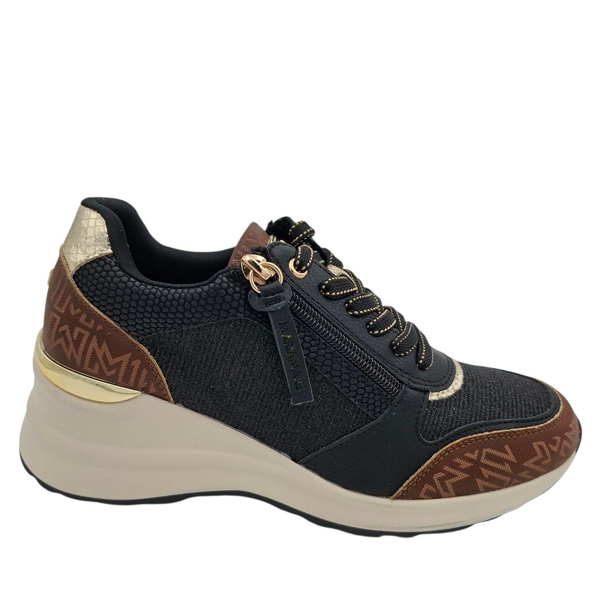 Γυναικεία sneakers της ισπανικής εταιρείας MARIAMARE με κορδόνια και λειτουργικό φερμουάρ στο πλάι για εύκολη και γρήγορη εφαρμογή. Είναι κατασκευασμένα εξωτερικά από μαλακό, συνθετικό δέρμα ματ, χρυσό μεταλλιζέ snake, καφέ print με το logo της εταιρείας δέρμα και μεταλλιζέ μαύρο ύφασμα, ενώ εσωτερικά είναι υφασμάτινα. Διαθέτουν ανατομικό, αφρώδες πατάκι για ξεκούραστο βάδισμα. Η σόλα είναι ελαφριά, αντιολισθητική με μεταλλική λεπτομέρεια και έχει ύψος 7 εκ. πίσω και 2,5 εκ. μπροστά. Άνετα και στυλάτα sneakers που θα απογειώσουν την εμφάνισή σας.