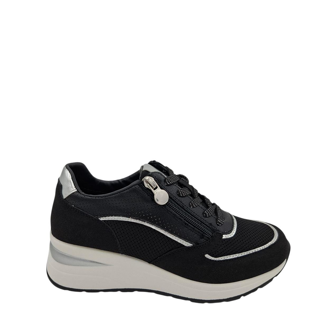 Γυναικεία sneakers της ιταλικής εταιρείας SUPER MODE με κορδόνια και λειτουργικό φερμουάρ στο πλάι για εύκολη και γρήγορη εφαρμογή. Είναι κατασκευασμένα εξωτερικά από μαλακό, συνθετικό δέρμα μαύρο ματ και ασημί μεταλλιζέ, ύφασμα, ενώ εσωτερικά είναι υφασμάτινα. Διαθέτουν αποσπόμενο, ανατομικό, αφρώδες πατάκι για ξεκούραστο βάδισμα. Η σόλα είναι ελαφριά, ελαστική, αντιολισθητική με λεπτομέρεια ασημί χρώματος και έχει ύψος 5,5 εκ. πίσω και 2,5 εκ. μπροστά. Άνετα και στυλάτα sneakers που θα απογειώσουν την εμφάνισή σας.