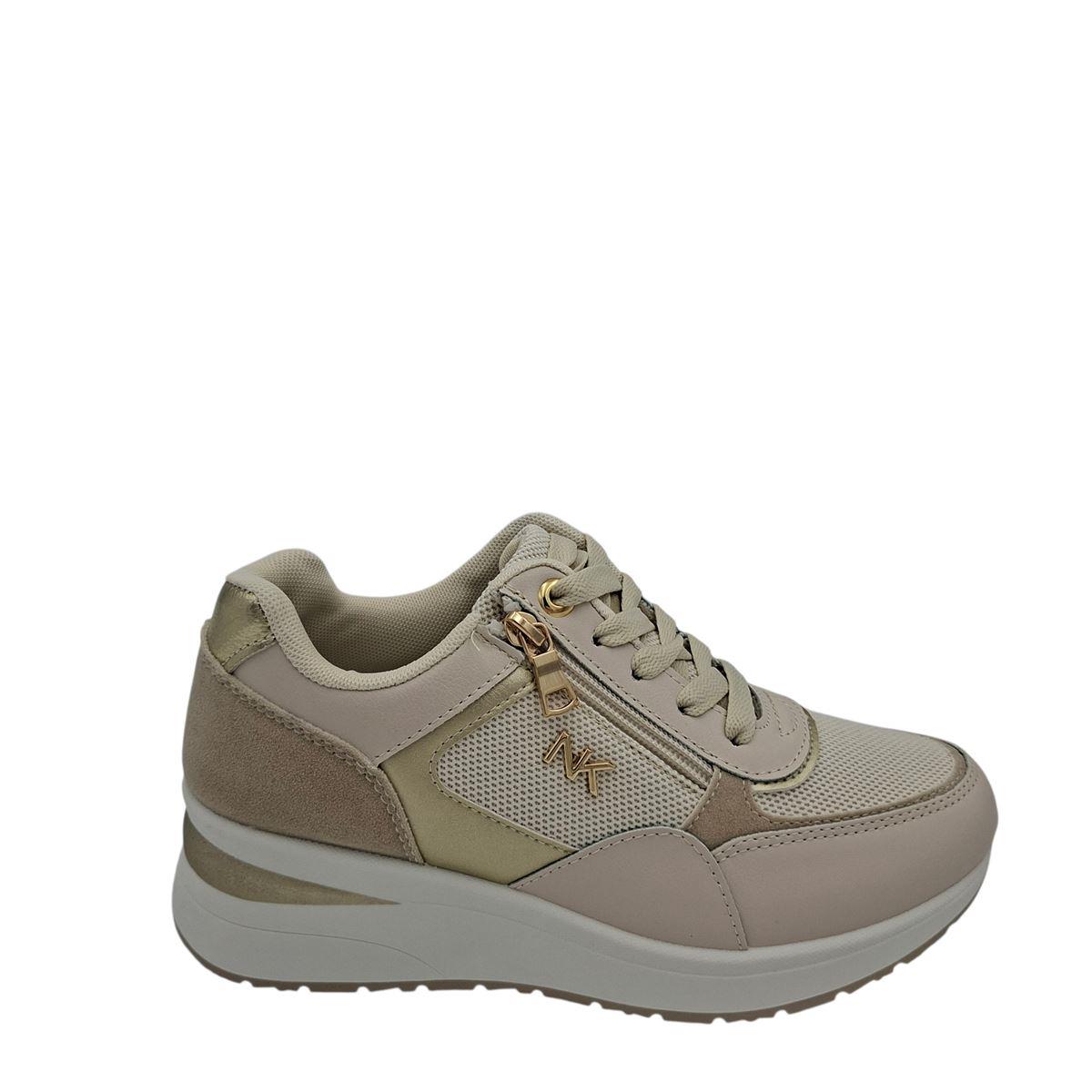 Γυναικεία sneakers της ιταλικής εταιρείας RENDA με κορδόνια και λειτουργικό φερμουάρ στο πλάι για εύκολη και γρήγορη εφαρμογή. Είναι κατασκευασμένα εξωτερικά από μαλακό, συνθετικό δέρμα μπεζ ματ και χρυσό μεταλλιζέ, ύφασμα, ενώ εσωτερικά είναι υφασμάτινα. Διαθέτουν αποσπόμενο, ανατομικό, αφρώδες πατάκι για ξεκούραστο βάδισμα. Η σόλα είναι ελαφριά, ελαστική, αντιολισθητική με λεπτομέρεια χρυσού χρώματος και έχει ύψος 5,5 εκ. πίσω και 2,5 εκ. μπροστά. Άνετα και στυλάτα sneakers που θα απογειώσουν την εμφάνισή σας.