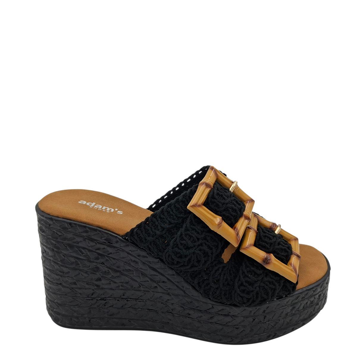 Γυναικείες παντόφλες της εταιρείας ADAM'S με ανατομικό πέλμα πλατφόρμας, κατασκευασμένες εξωτερικά από πλεχτό ύφασμα και κοκάλινες τόκες, οι οποίες ρυθμίζονται σε όλα τα πόδια, ενώ εσωτερικά η φόδρα είναι υφασμάτινη και το πατάκι συνθετικό δέρμα. Διαθέτουν αφρώδη επένδυση εσωτερικά στο πατάκι για μαλακό πάτημα. Η σόλα είναι ελαφριά, παρόλο τον όγκο της, έχει ύψος 10 εκ. πίσω και 4 εκ. μπροστά, και έχει την όψη του σχοινιού για πιο καλοκαιρινό ύφος, αλλά αντέχει και σε πιο "σκληρές" συνθήκες. Εντυπωσιακές παντόφλες που ταιριάζουν με πολλά outfits συνδυάζοντας άνεση και στυλ.