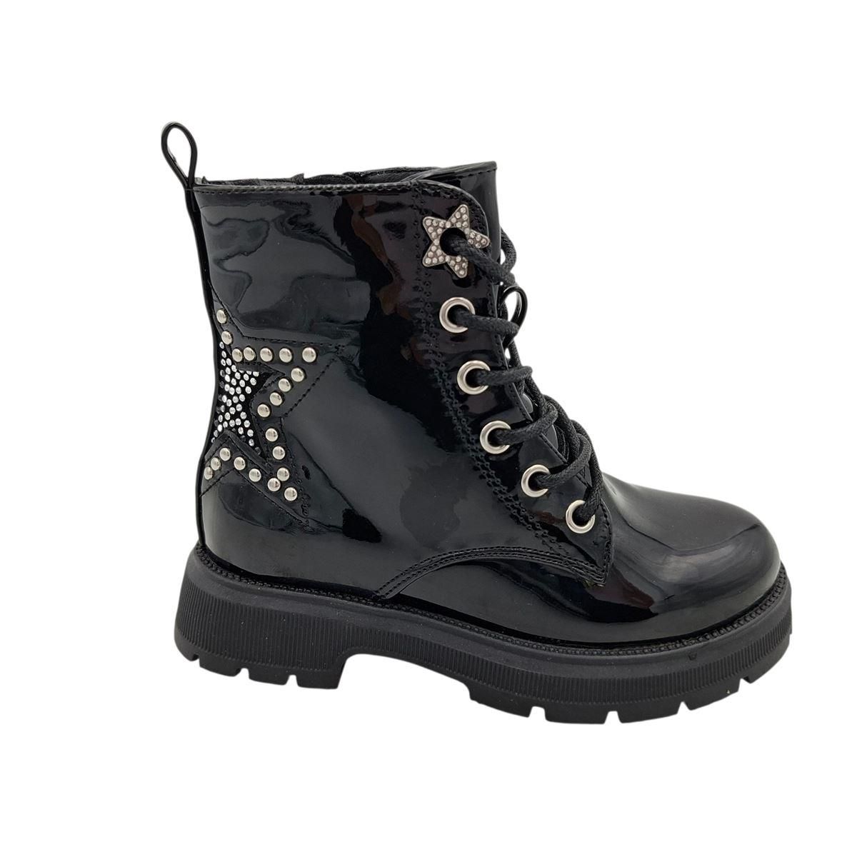 Μποτάκια για κορίτσια της ιταλικής εταιρείας BACIO & BACIO με κορδόνια και φερμουάρ στο πλάι για εύκολη και γρήγορη εφαρμογή. Είναι κατασκευασμένα εξωτερικά από μαλακό συνθετικό λουστρίν, ενώ εσωτερικά η φόδρα είναι υφασμάτινη και το πατάκι συνθετικό δέρμα. Η σόλα είναι ανατομική, ελαφριά και ελαστική, ιδανική για την κάθε δραστηριότητα του παιδιού. Στο πλάι υπάρχουν αστεράκια από ασημένια τρουκς και στη κορδονιέρα ψηλά το κορδόνι περνάει μέσα από τρυπούλα σε σχήμα αστεριού με στρασάκια, δίνοντας μια νότα λάμψης στην εμφάνιση των μικρών μας φίλων. Ιδανικά μποτάκια για όλες τις περιστάσεις είτε επίσημες είτε καθημερινές.