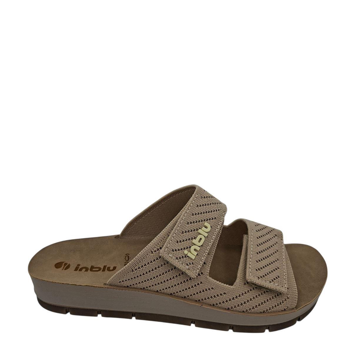 Γυναικείες ανατομικές παντόφλες της ιταλικής εταιρείας INBLU με δύο λουράκια που κλείνουν με αυτοκόλλητο και που προσαρμόζονται σε όλους τους τύπους ποδιών. Είναι κατασκευασμένες εξωτερικά από μαλακό ύφασμα, ενώ εσωτερικά η φόδρα είναι υφασμάτινη και το πατάκι συνθετικό δέρμα. Διαθέτουν αφρώδη εσωτερική επένδυση για ξεκούραστο βάδισμα. Η σόλα είναι ελαφριά και ελαστική. Το ύψος της είναι 3 εκ. πίσω και 2 εκ. μπροστά. Μπορούν να φορεθούν είτε μέσα στο σπίτι είτε έξω.