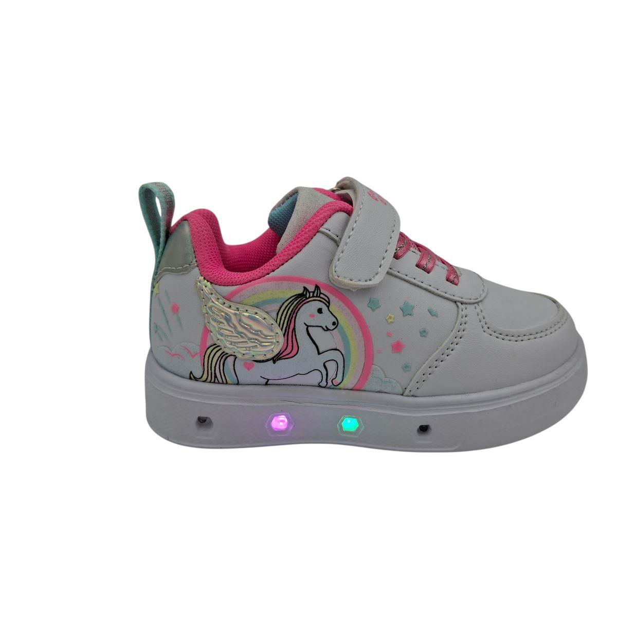 Sneakers για κορίτσια της ιταλικής εταιρείας GIARDINO D'ORO με λαστιχωτά κορδόνια και αυτοκόλλητο για εύκολη και γρήγορη εφαρμογή. Είναι κατασκευασμένα εξωτερικά από μαλακό, συνθετικό δέρμα, ενώ εσωτερικά είναι υφασμάτινα. Η σόλα είναι ανατομική, ελαφριά και ελαστική, ιδανική για την κάθε δραστηριότητα του παιδιού. Η σόλα έχει μηχανισμό με πολύχρωμα φωτάκια, που αναβοσβήνουν ρυθμικά. Με εντυπωσιακό σχέδιο μονόκερο στο πλάι, που θα ξετρελάνει τις μικρές μας φίλες.