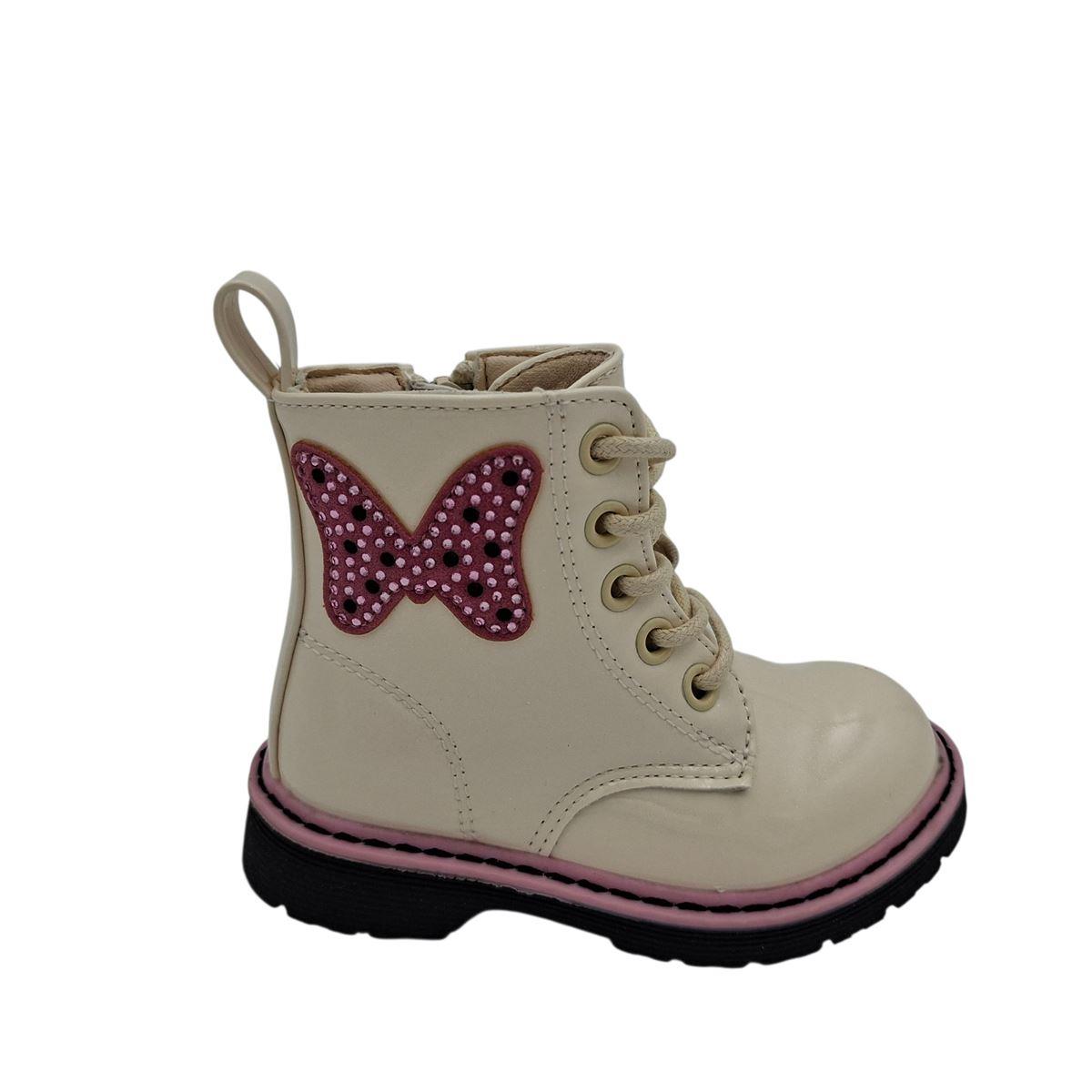 Μποτάκια για κορίτσια της ιταλικής εταιρείας GIARDINO D'ORO με κορδόνια και φερμουάρ στο πλάι για εύκολη και γρήγορη εφαρμογή. Είναι κατασκευασμένα εξωτερικά από μαλακό συνθετικό λουστρίν, το οποίο έχει στη σύνθεσή του glitter, ενώ εσωτερικά  η φόδρα και το πατάκι είναι υφασμάτινα. Η σόλα είναι ανατομική, ελαφριά και ελαστική, ιδανική για την κάθε δραστηριότητα του παιδιού. Στο πλάι υπάρχει σχέδιο φιόγκος με στρασάκια, δίνοντας μια νότα λάμψης στην εμφάνιση των μικρών μας φίλων. Διαθέτουν και extra φιόγκο από πλαστικό που μπορεί να μπει στα κορδόνια ξεκουμπώνοντας το ειδικό clip και έτσι θα έχετε ένα ακόμα πιο χαριτωμένο σχέδιο. Ιδανικά μποτάκια για όλες τις περιστάσεις είτε επίσημες είτε καθημερινές.