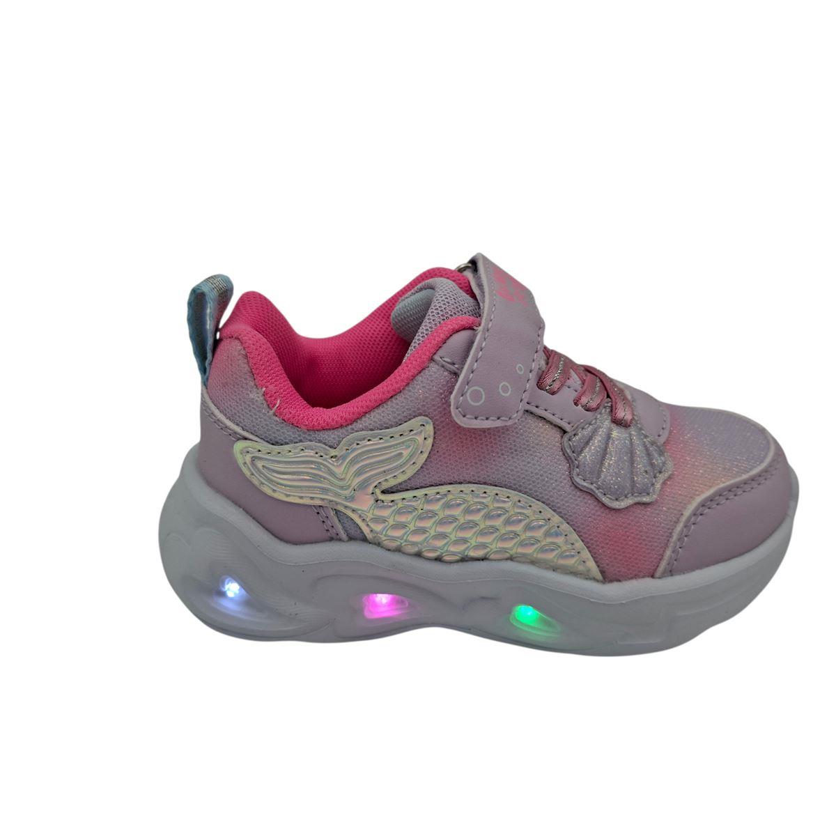 Αθλητικά για κορίτσια της ιταλικής εταιρείας GIARDINO D'ORO με λαστιχωτά κορδόνια και αυτοκόλλητο για εύκολη και γρήγορη εφαρμογή. Είναι κατασκευασμένα εξωτερικά από μαλακό, συνθετικό δέρμα και μεταλλιζέ ύφασμα, ενώ εσωτερικά είναι υφασμάτινα. Η σόλα είναι ανατομική, ελαφριά και ελαστική, ιδανική για την κάθε δραστηριότητα του παιδιού. Η σόλα έχει μηχανισμό με πολύχρωμα φωτάκια, που αναβοσβήνουν ρυθμικά. Με εντυπωσιακό σχέδιο ουρά γοργόνας που θα ξετρελάνει τις μικρές μας φίλες.