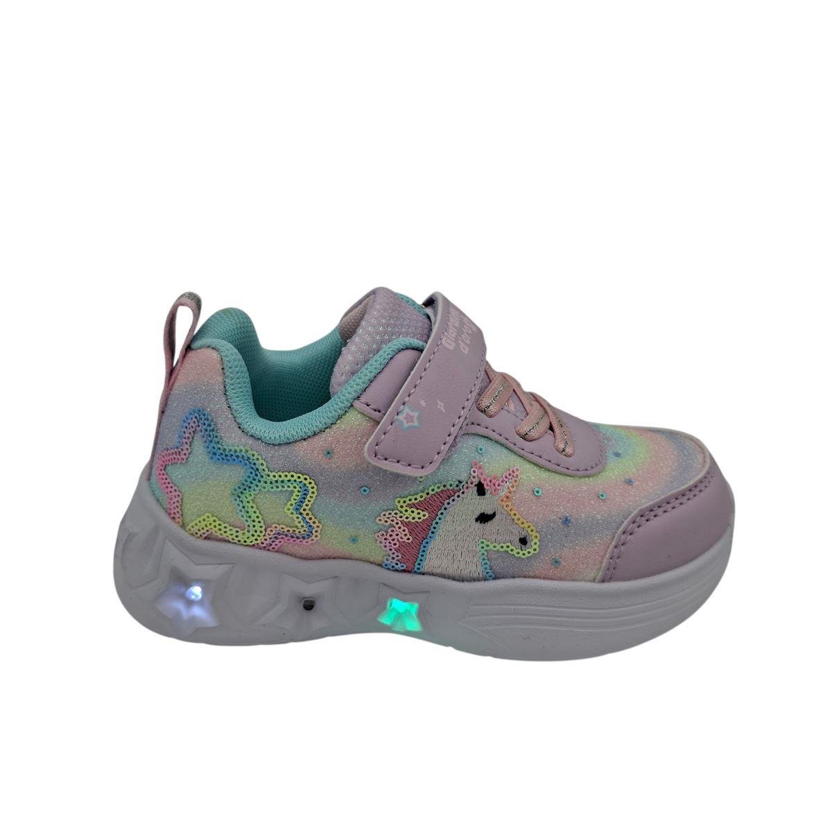 Αθλητικά για κορίτσια της ιταλικής εταιρείας GIARDINO D'ORO με λαστιχωτά κορδόνια και αυτοκόλλητο για εύκολη και γρήγορη εφαρμογή. Είναι κατασκευασμένα εξωτερικά από μαλακό, συνθετικό δέρμα και μεταλλιζέ ύφασμα, ενώ εσωτερικά είναι υφασμάτινα. Η σόλα είναι ανατομική, ελαφριά και ελαστική, ιδανική για την κάθε δραστηριότητα του παιδιού. Η σόλα έχει μηχανισμό με πολύχρωμα φωτάκια, που αναβοσβήνουν ρυθμικά. Με πολύ όμορφο σχέδιο μονόκερο και χρώματα του ουράνιου τόξου, που θα ξετρελάνει τις μικρές μας φίλες.