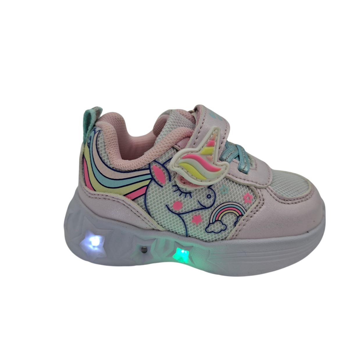 Αθλητικά για κορίτσια της ιταλικής εταιρείας GIARDINO D'ORO με λαστιχωτά κορδόνια και αυτοκόλλητο για εύκολη και γρήγορη εφαρμογή. Είναι κατασκευασμένα εξωτερικά από μαλακό μεταλλιζέ συνθετικό δέρμα και μεταλλιζέ ύφασμα, ενώ εσωτερικά είναι υφασμάτινα. Η σόλα είναι ανατομική, ελαφριά και ελαστική, ιδανική για την κάθε δραστηριότητα του παιδιού. Η σόλα έχει μηχανισμό με πολύχρωμα φωτάκια, που αναβοσβήνουν ρυθμικά. Με πολύ όμορφο σχέδιο μονόκερο και ουράνιο τόξο, που θα ξετρελάνει τις μικρές μας φίλες.