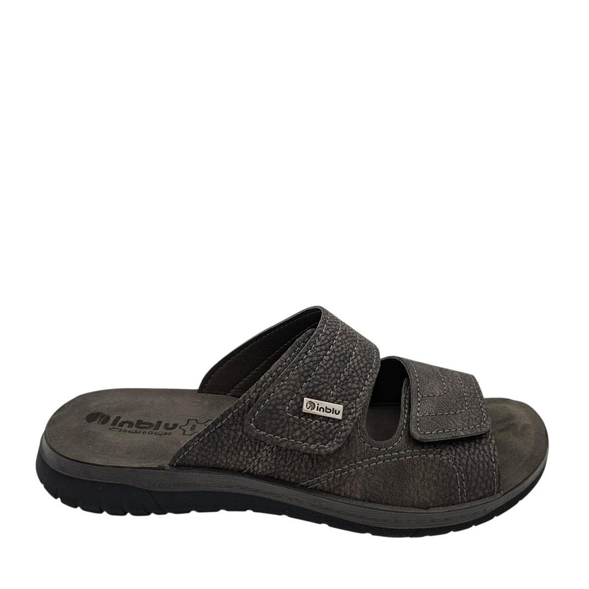 Ανδρικές ανατομικές παντόφλες της ιταλικής εταιρείας INBLU με δύο λουράκια που κλείνουν με αυτοκόλλητα και προσαρμόζονται σε όλα τα πόδια. Είναι κατασκευασμένες εξωτερικά από μαλακό, συνθετικό δέρμα άριστης ποιότητας, ενώ εσωτερικά το πατάκι είναι γνήσιο δέρμα και η φόδρα συνθετικό δέρμα. Διαθέτουν ανατομικό πέλμα και πατάκι με επένδυση αφρολέξ για μαλακό και ξεκούραστο βάδισμα. Η σόλα είναι ελαφριά, ελαστική και αντιολισθητική. Ιδανικές παντόφλες για πολύωρη χρήση στο σπίτι, αλλά και για τις καθημερινές σας βόλτες.