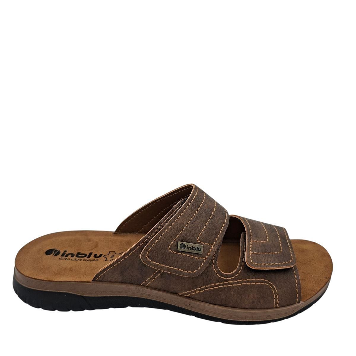 Ανδρικές ανατομικές παντόφλες της ιταλικής εταιρείας INBLU με δύο λουράκια που κλείνουν με αυτοκόλλητα και προσαρμόζονται σε όλα τα πόδια. Είναι κατασκευασμένες εξωτερικά από μαλακό, συνθετικό δέρμα άριστης ποιότητας, ενώ εσωτερικά το πατάκι είναι γνήσιο δέρμα και η φόδρα συνθετικό δέρμα. Διαθέτουν ανατομικό πέλμα και πατάκι με επένδυση αφρολέξ για μαλακό και ξεκούραστο βάδισμα. Η σόλα είναι ελαφριά, ελαστική και αντιολισθητική. Ιδανικές παντόφλες για πολύωρη χρήση στο σπίτι, αλλά και για τις καθημερινές σας βόλτες.